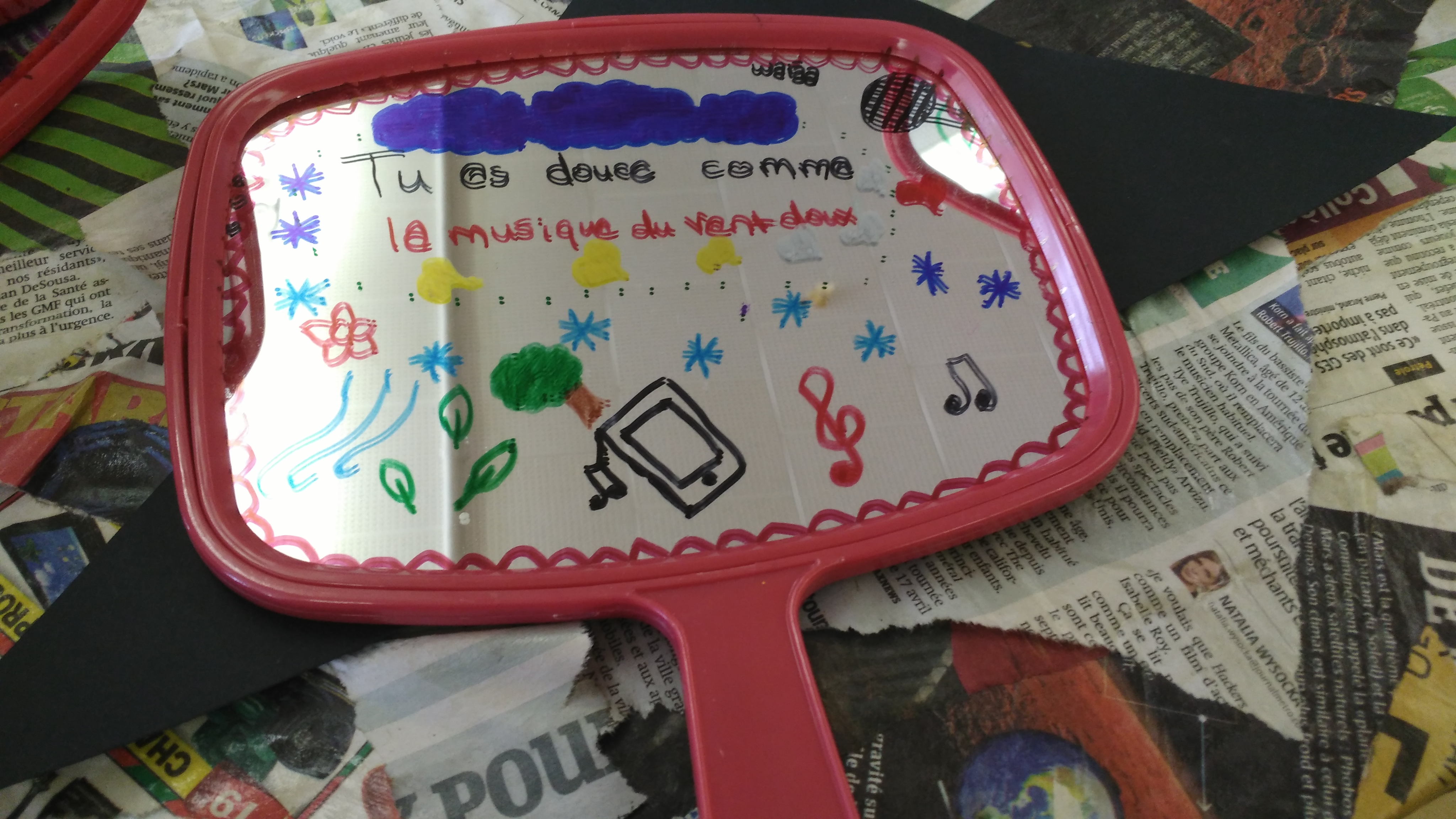 Pour commencer ces quatres semaines d’atelier, les jeunes ont d’abord réfléchi à l’omniprésence de la beauté physique stéréotypée. Ils ont découpé et en collé des images trouvées dans des magazines de mode. Par la suite, ils ont exploré l’univers des figures de style et ont chacun écrit un compliment qui utilise la comparaison comme procédé. Les animateurs ont poussé les jeunes à dépasser les clichés qui tournent autour de la beauté. Certaines phrases inventées créaient un effet d’une grande poésie!